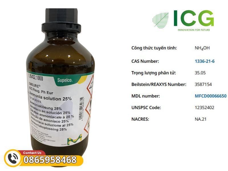 - Tên gọi khác: Ammonium hydroxide solution, Ammonia water, Ammonia aqueous, NH₄OH, Ammonia solution 28–30% for analysis – Merck 105423, Chất ammonia solution 28%, Nước amoniac, Dung dịch amoni Merck Đức
