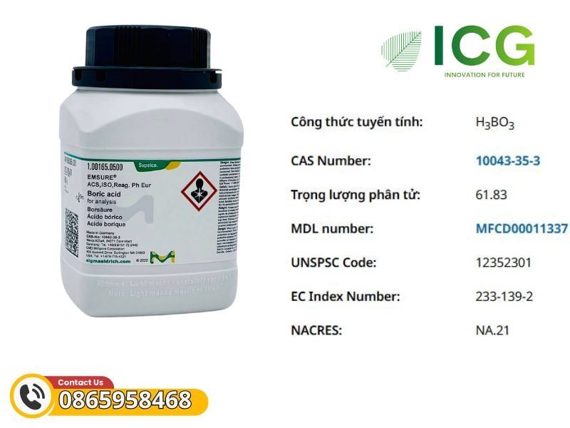 - Tên gọi khác: Orthoboric acid, Trihydroxidoboron, Boracic acid, Optibor, Borofax, Boric acid CAS 10043-35-3, Acid Boric – 1001650500 – Merck, H₃BO₃ Merck, Hoá chất Boric acid 99.5–100.5% for analysis Merck Germany.