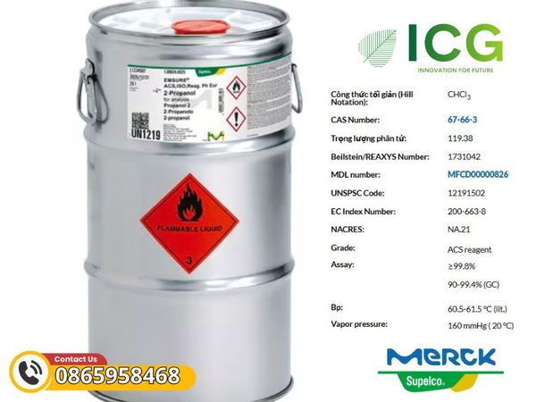 - Tên gọi khác: Chloroform CAS 67-66-3, Chloroform Merck Germany, Hoá chất Chloroform Merck, MERCK 102445 Chloroform for analysis EMSURE