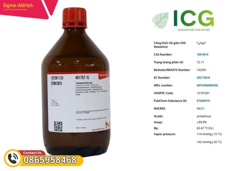 - Tên tiếng Anh: Tetrahydrofuran, anhydrous, ≥99.9%, inhibitor-free